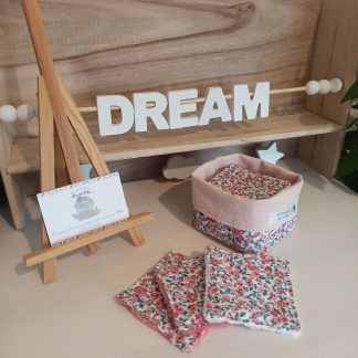 Panier avec 10 Lingettes Lavables liberty fleurs roses bleues
