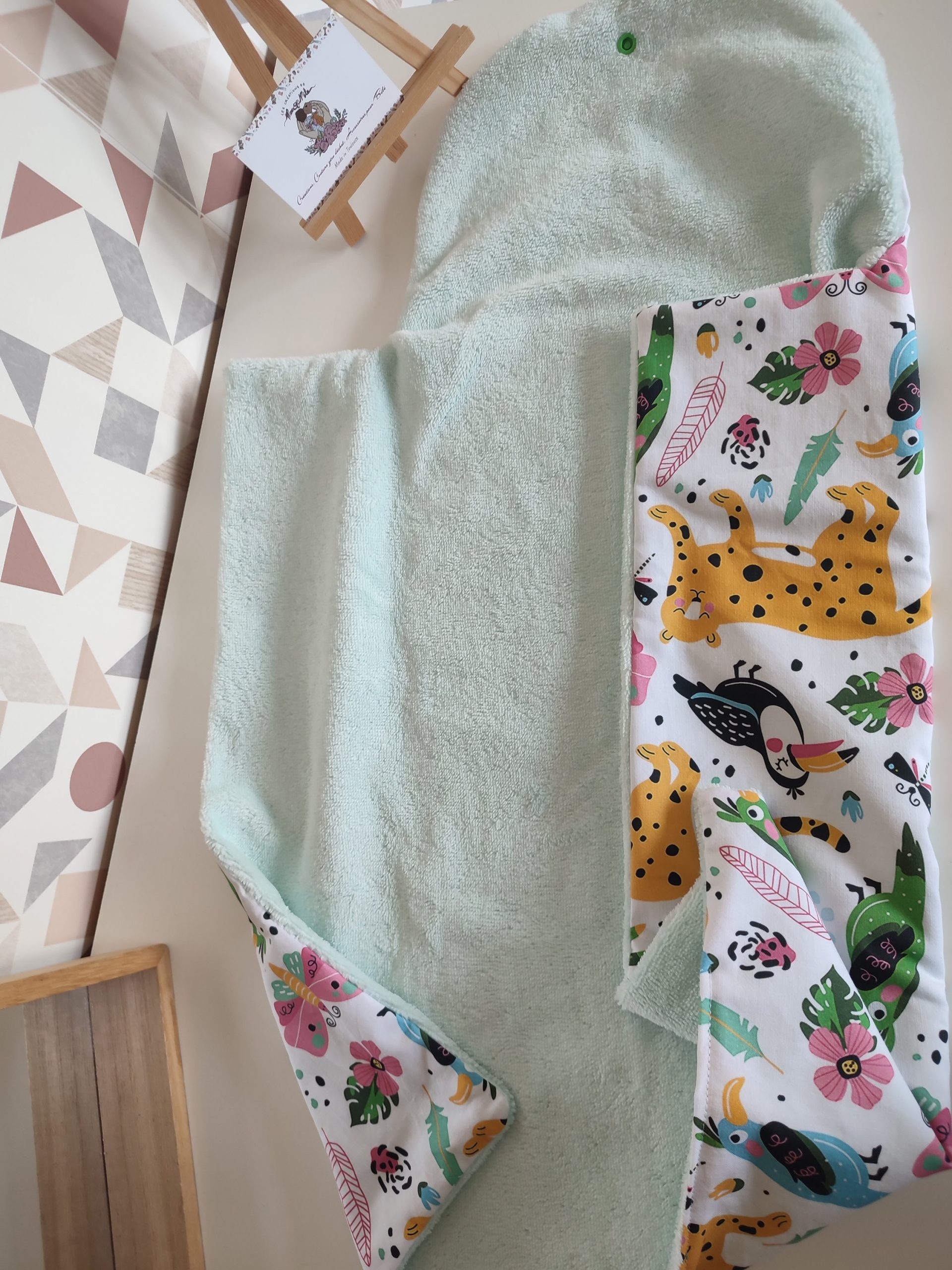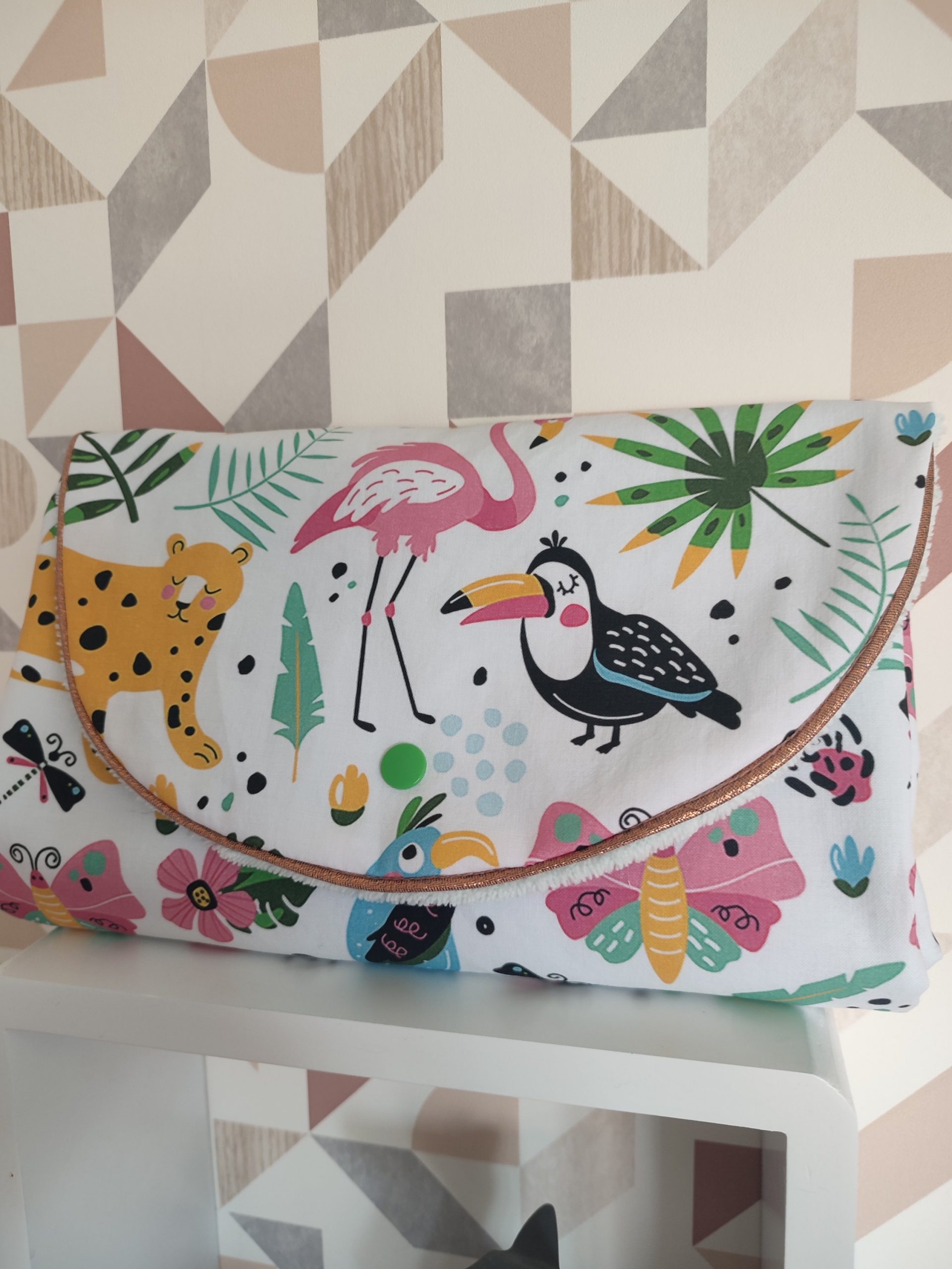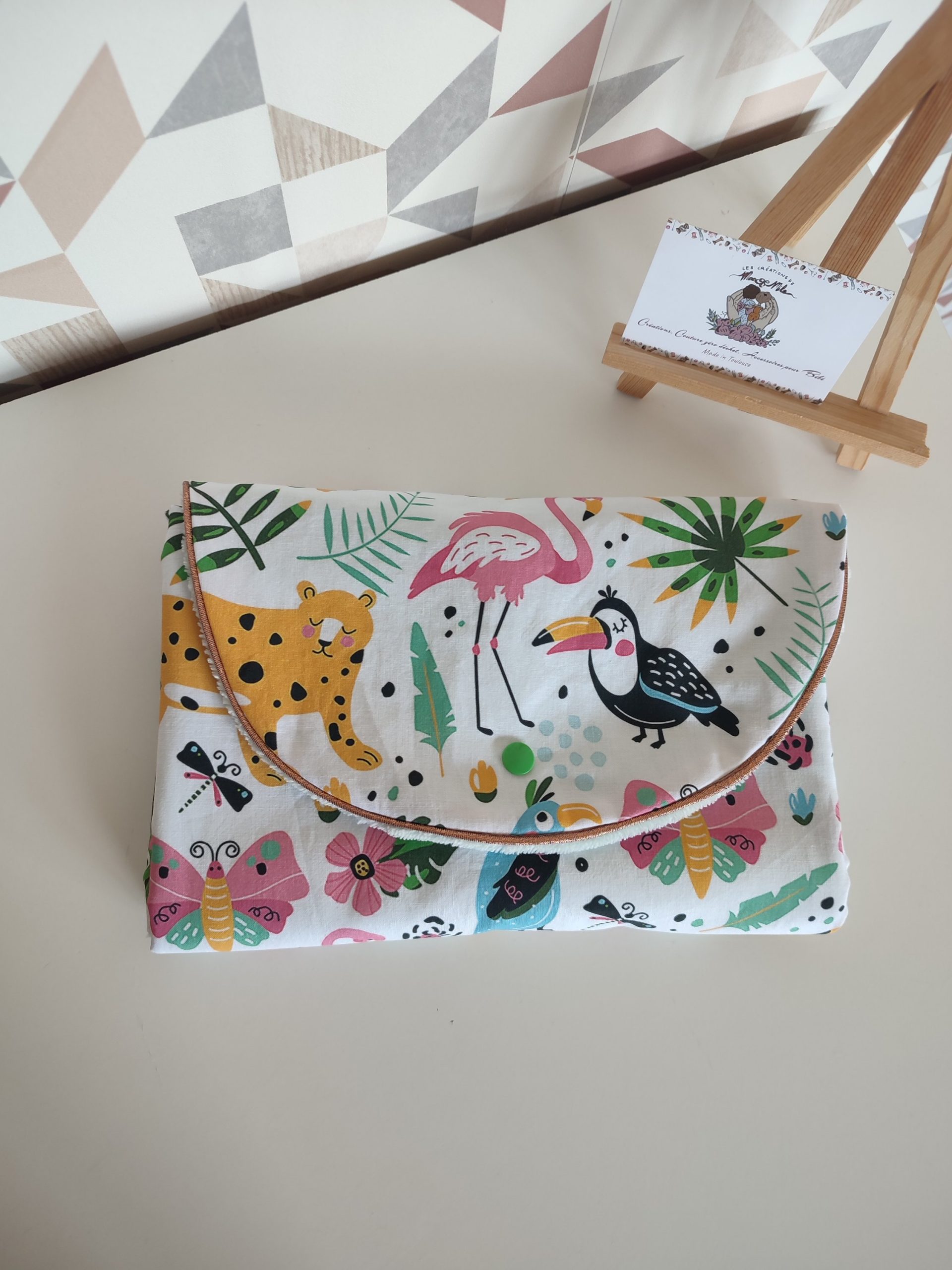 Cette petite pochette tapis a langer nomade  sera idéale pour changer bébé lors de de vos balades. Elle vous accompagnera partout grâce à son format compact et pratique.  Elle est constituée d’une face coton à l’extérieur de la pochette et d’ une face éponge de bambou douce a l’intérieur. Des tissus respectueux de la peau de bébé et de l’environnement avec leur certification Oekotex. La pochette se referme grâce a un bouton pression.